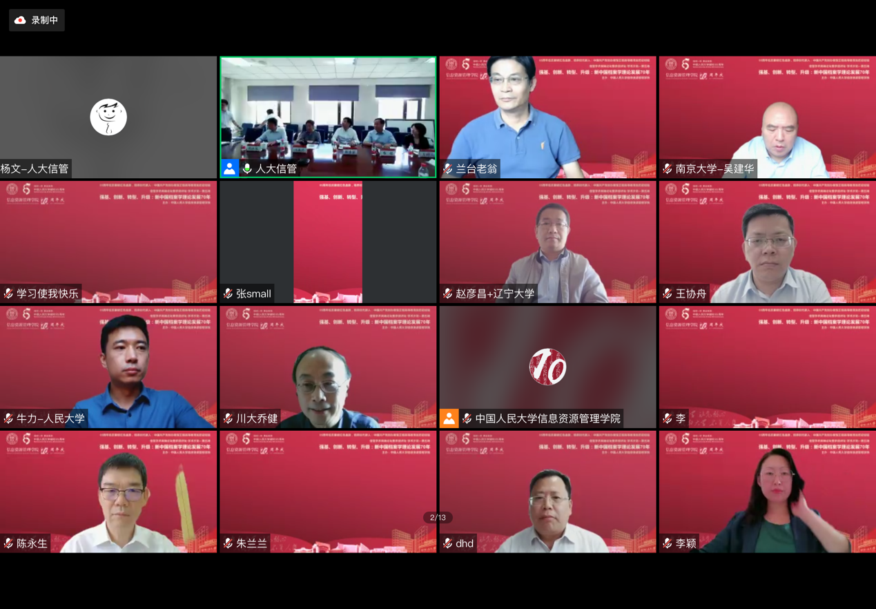 围绕“强基、创新、转型、升级——新中国档案学理论发展70年”,丁华东、覃兆刿、赵彦昌、刘旭光、乔建、吴建华、李财富、李颖、华林分别以“档案记忆再生产的前沿问题”“不忘初心,注重内容:档案学科建设与人才培养的内涵式发展”“辽宁大学档案学建设与发展”“档案学的传承与创新”“数字转型背景下档案学的守正与创新”“对一级学科更名背景下档案学发展的思考”“新中国成立以来的档案学分支学科建设”“档案学理论传播与赋能社会”“民族档案理论与实践”为话题,分享了对70年来中国档案学理论生产、创新、转型、升级的思考与认识。