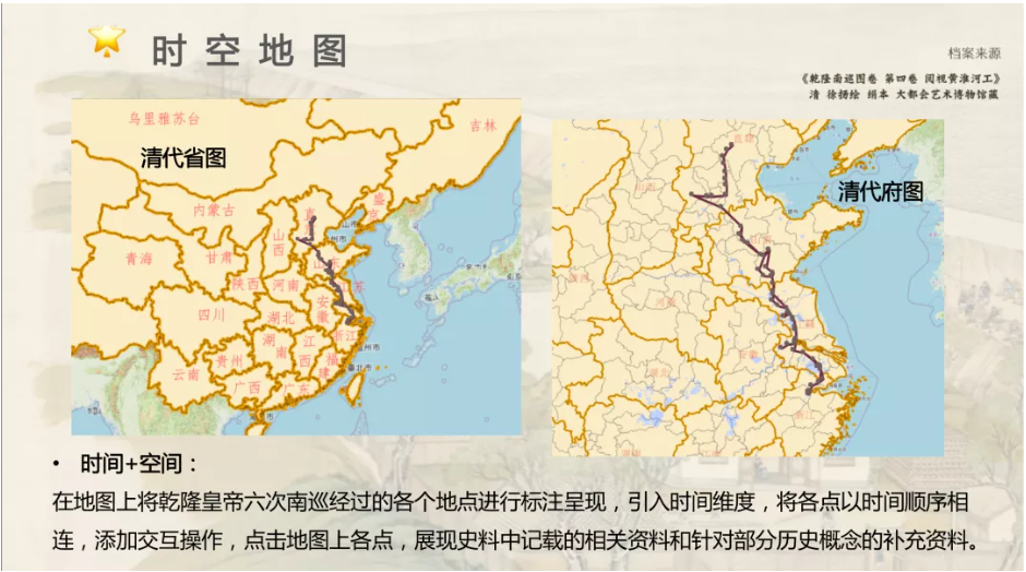 该研究提出时间、空间、主题维度下专题档案资源建设和数字人文技术相结合的开发利用实现路径,并以乾隆南巡档为实例,运用数据库、时空地图、3D 建模、动画制作等多种数字人文技术,绘制时空地图,搭建“跟着乾隆去打卡”专题网站。