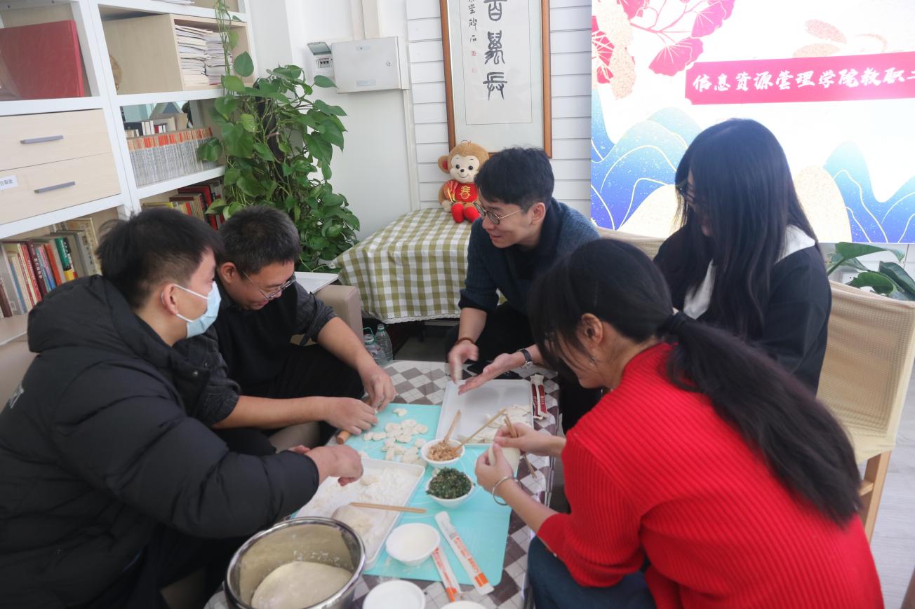 教职工们组成档案系、图书情报系、数字人文系、信息管理与分析系、行政教辅团队5支队伍比赛包饺子,各支队伍自备食材,分工合作,不一会儿工夫,一盘盘热气腾腾的饺子就端上了桌。随着饺子一起上桌的,还有老师们各自准备的拿手菜品,凉菜、热菜、水果、甜点、饮料,一应俱全。