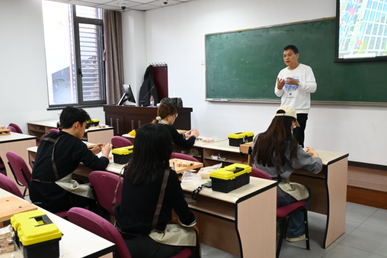 在本次课程中,黄老师讲解了六柱鲁班锁的基本构造与拆装规律,同学们进行“拆卸—记忆—复原”的体验式学习,不仅掌握了基本结构逻辑,也感受到传统技艺中所蕴含的耐心、细致与推演能力。
