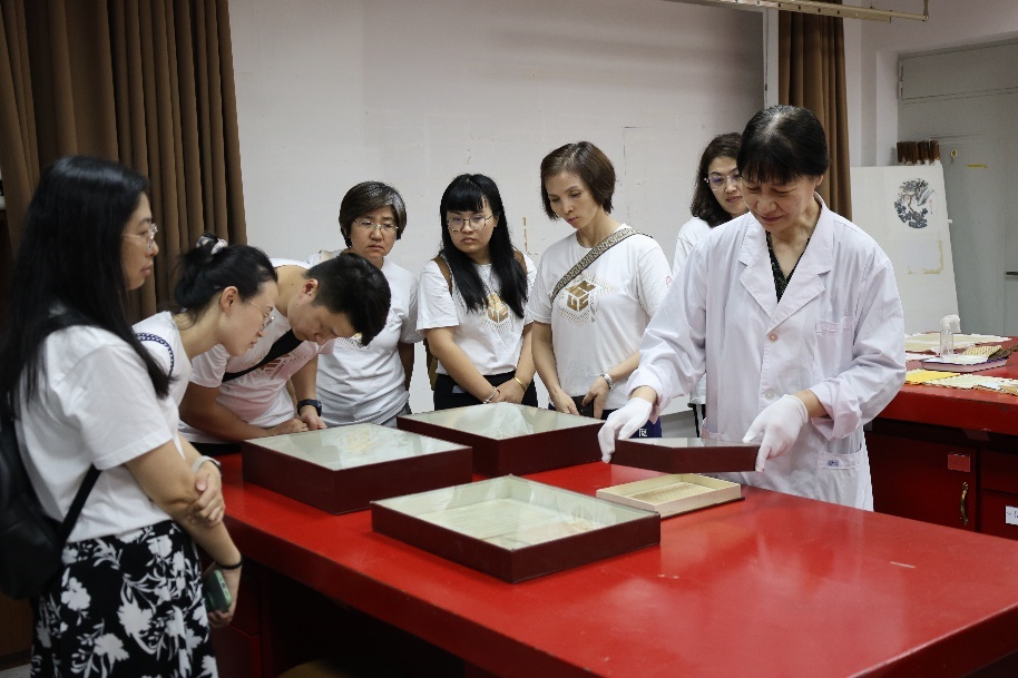 此外,学员们还走进了档案保护实验室、修复实验室。在档案修复实验室,高级实验师闫政老师以字画装裱为例介绍了实验课程中所需的修复工具和流程。在档案保护实验室,闫老师介绍了档案文献用纸质量检测实验和部分科研检测的方法。