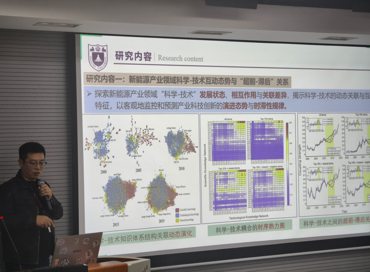 巴志超的主旨报告题为“新兴产业领域科技耦合共生与协同创新机制”。他围绕新兴产业领域的科学与技术耦合过程及协同创新机制展开了系统探讨,展示了多个维度的研究方法与实证研究成果。他从科学-技术系统耦合视角出发,将网络相似/图拓扑距离计算引入科技知识关联的识别中,构建科学-技术知识网络的时序关联测度框架,并结合时序网络出现的科学-技术超前-滞后关联、层级/社群交互、交叉地带/边缘等现象分析特定领域科学-技术协同路径、模式与效应,并用于识别潜在技术机会、突破性方向以及科技发展前沿等。巴志超指出,未来可将低度节点等弱信号信息纳入科学与技术关联探测中。