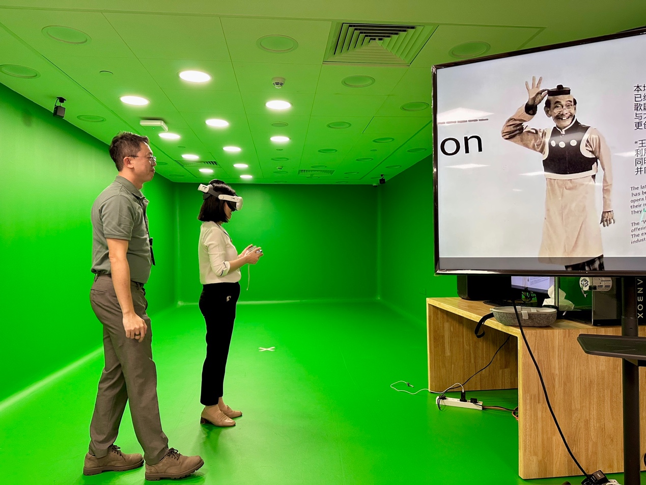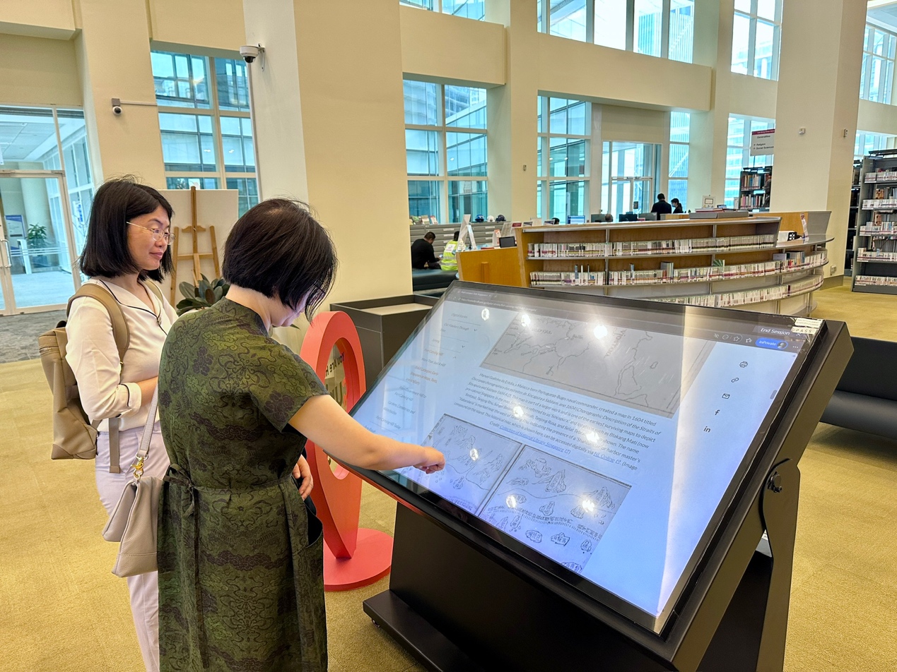 会谈前,刘越男院长一行在图书馆馆长Natalie Pang教授陪同下,参观了新加坡国立大学图书馆,了解数字人文硕士课程、3D打印、数字展览等建设情况,体验王沙数字展览以及360度影厅在数字人文项目展览中的应用。