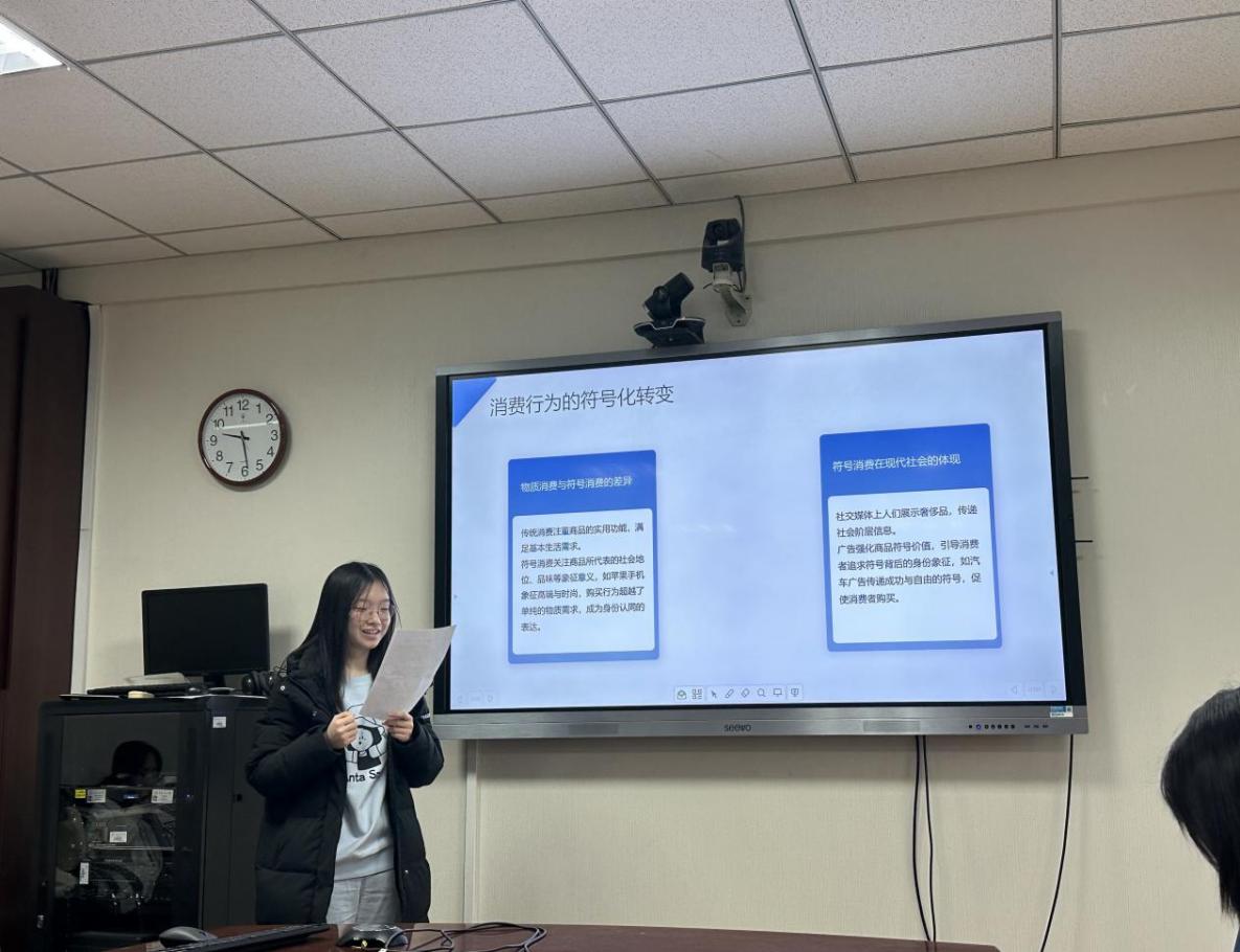王亚轩同学探讨了消费社会转型中从物质到符号的转变、象征性交换、符号与拟像的统治等现象,认为个人应保持批判性思维、理性消费、独立思考,社会应关注大众力量,在符号与拟像的世界中寻找发展方向,实现个人成长与社会发展相互促进。