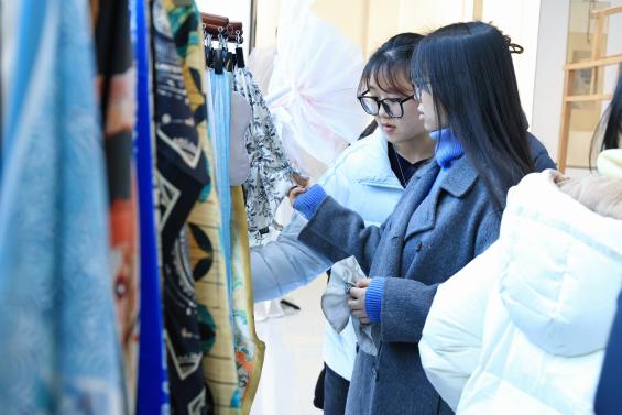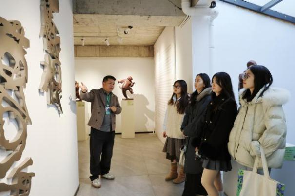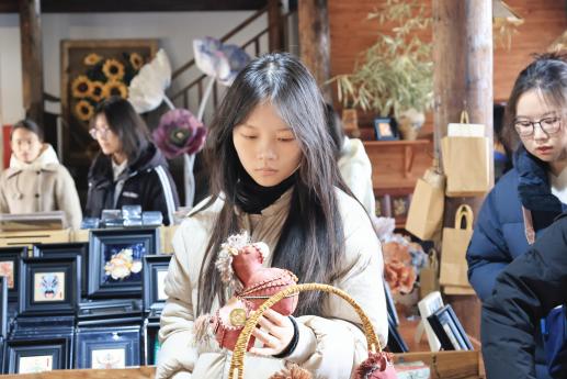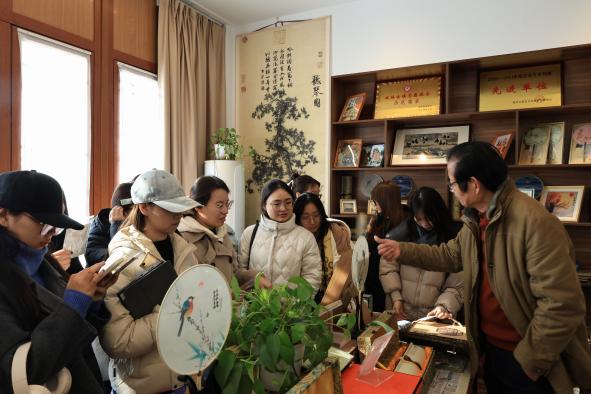 在旧馆街道,实践团先是在港廊古村落村支书慎晓翠带领下,踏入“因河成市、依水成街”的水乡古村:探访武状元谢源故居解元廨,老药材柜与中药香气诉说家族从武举到悬壶济世的积淀;走进米娅艺术工作室,非遗传承人潘菲菲的宋锦骏马衍纸作品惊艳众人,传统工艺焕发新生;驻足金香香馆,沉浸式感受千年香文化魅力。此外,实践团还探访南浔丝绸文化产业园,这里“前店后厂”的模式让传统技艺与高校创新平台碰撞活力,在触摸辑里湖丝中读懂丝绸古今传承密码。